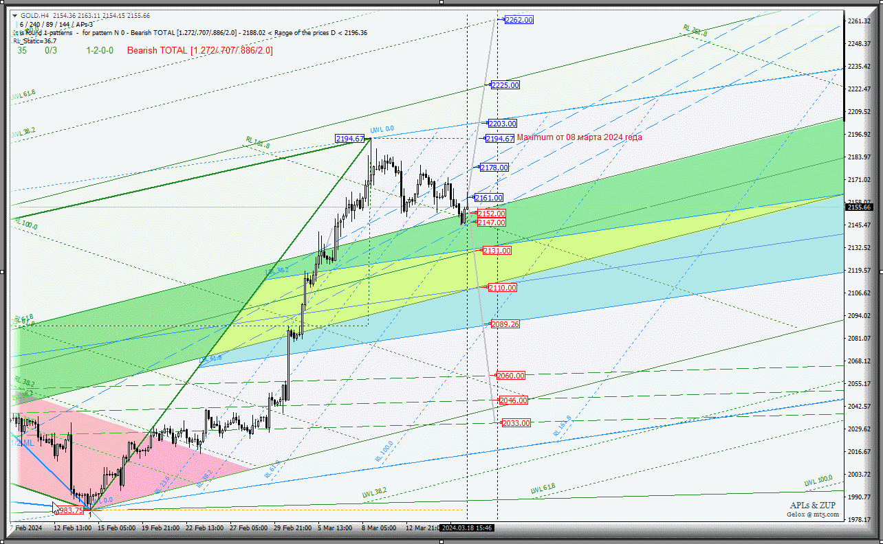 С 19 марта 2024 года Spot Gold -h4 станет развивать свое движение с учетом варианта отработки паттерна Гартли и направления пробоя границ канала 1/2 Median Line (2178.00 - 2161.00 - 2147.00) вил младшего операционного масштаба MInuette-h1.