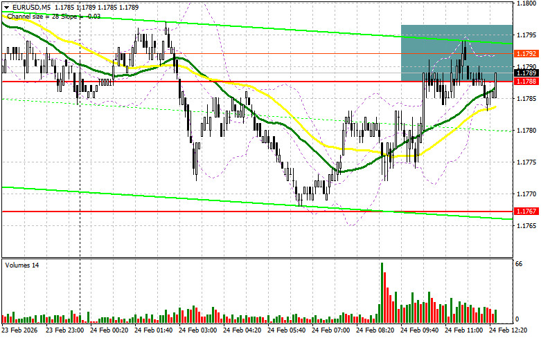 В своем утреннем прогнозе я обращал внимание на уровень 1.1788 и планировал от него принимать решения по входу в рынок. Давайте посмотрим на 5-минутный график и разберемся с тем, что там произошло. Рост и формирование ложного пробоя в области 1.1788 привели к точке входа на продажу евро, однако до крупного падения пары дело так и не дошло. На вторую половину дня техническая картина не пересматривалась.Для открытия длинных позиций по EURUSD требуется:Отсутствие статистики по еврозоне сказалось на рыночной волатильности, что не