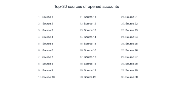 • Puede rastrear las estadisticas generales de las cuentas registradas, senalar los meses fructiferos, marcar un descenso en la actividad de referencia o encontrar las razones para buscar una nueva estrategia de marketing mas eficaz.