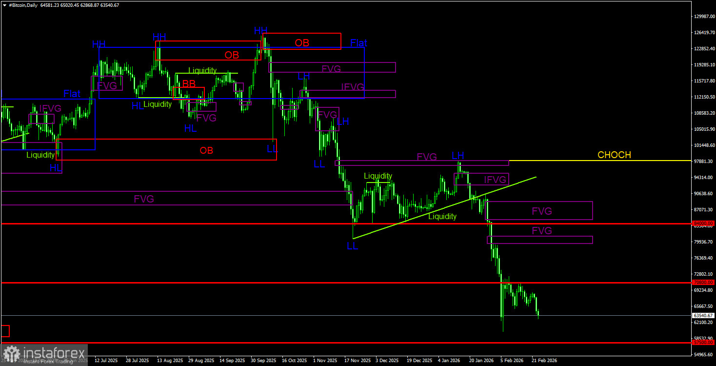 На дневном ТФ биткоин продолжает формирование нисходящей тенденции. Структура тренда идентифицируется, как нисходящая, а линия CHOCH в данное время проходит на уровне 97 900$. Только выше этого уровня можно будет считать, что нисходящий тренд завершен. Напомним, что сигнал на продажу был сформирован внутри «медвежьего» FVG(96 900$ – 98 000$) и получил подтверждение на младшем ТФ. Таким образом, трейдеры имели прекрасную возможность забрать практически все последнее движение вниз. Текущей целью остается уровень 57 500$ – 61,8% по Фибоначчи. Так как признаков разворота нет, мы считаем, что падение будет продолжено. На дневном ТФ ближайшая область POI для новых сделок на продажу находится в диапазоне 79 500$ – 81 100$, но до нее биткоину еще нужно добраться.