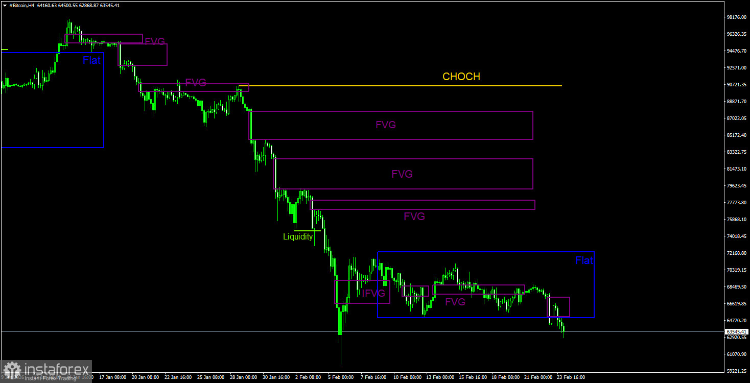 На 4-часовом таймфрейме цена также продолжает формирование нисходящей структуры. Линия CHOCH проходит на уровне 90 560$, только выше нее можно будет говорить о преобразовании тренда в восходящий. Однако на данный момент нет никаких признаков того, что биткоин может завершить падение в ближайшее время. Флэт, скорее всего, завершен. Девиация нижней границы не получила подтверждения на младшем ТФ. Цена опустилась ниже бокового канала. Сформирован очередной «медвежий» паттерн, на который уже была получена реакция.